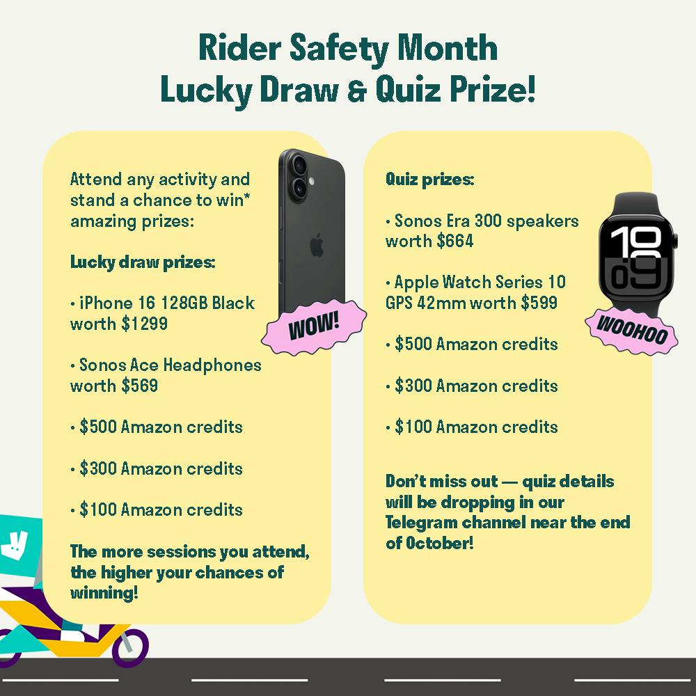 Join us for in-person workshops like the Advanced Defensive Riding Course (ADRC) and Red Cross Basic First Aid + AED, plus eye health screenings and wellness activities with our partners. Can’t make it down? Tune in to virtual sessions led by the Traffic Police and HPB, or take part in our Rider Safety Quiz at the end of the month.